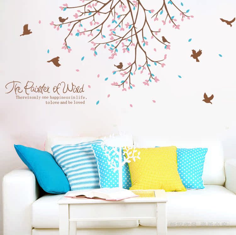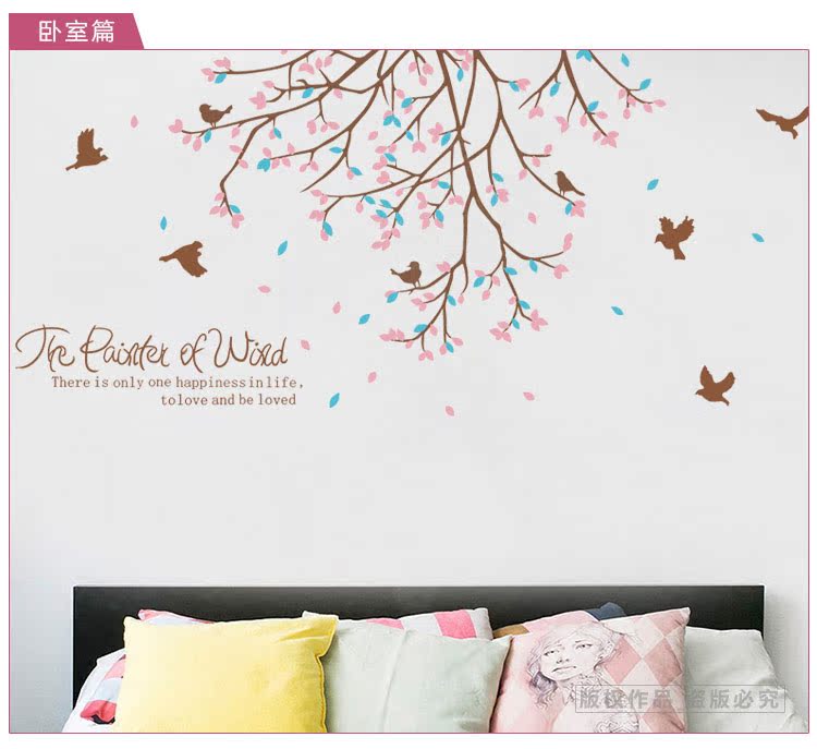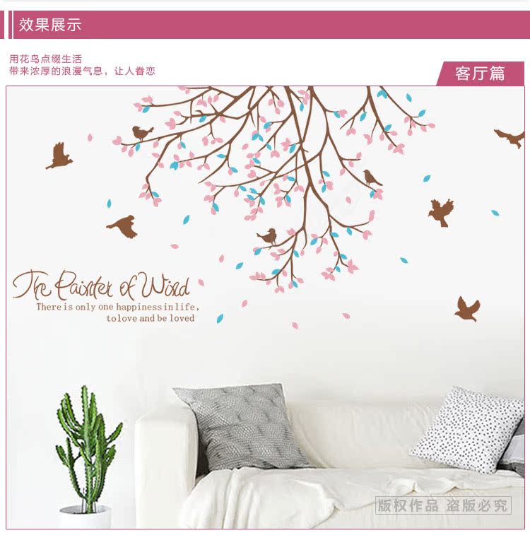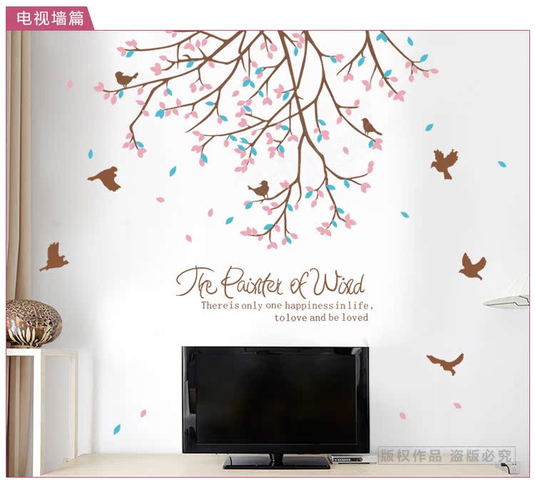 圖片色特大墻貼 唯美樹枝粉花飛鳥田園花卉貼紙 客廳電視墻背景裝飾可移除貼