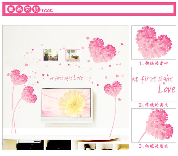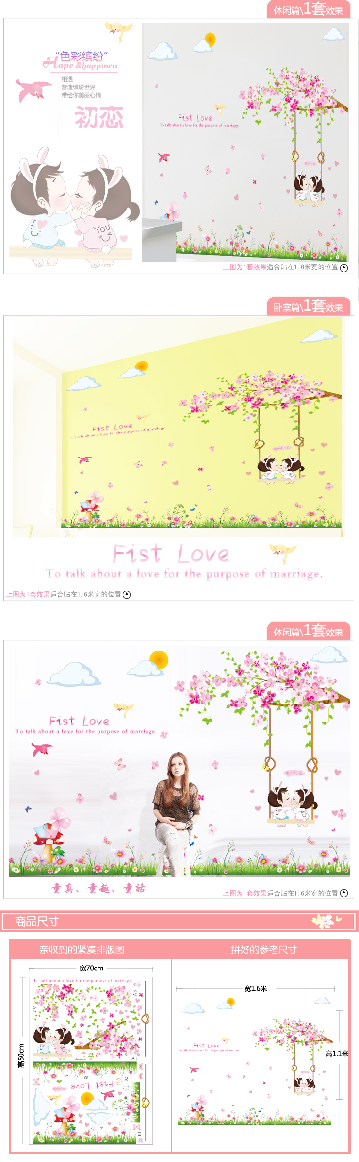 愛心照片繩超大浪漫初戀 情侶櫻花樹下蕩秋千 墻貼客廳臥室婚房床頭墻壁裝飾貼紙