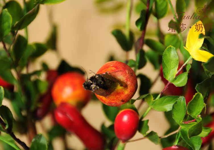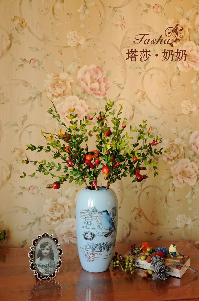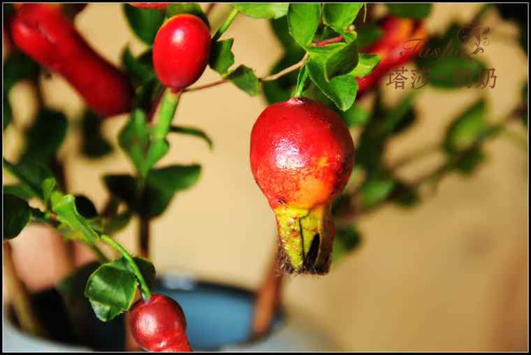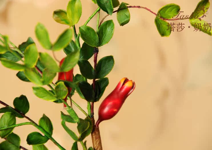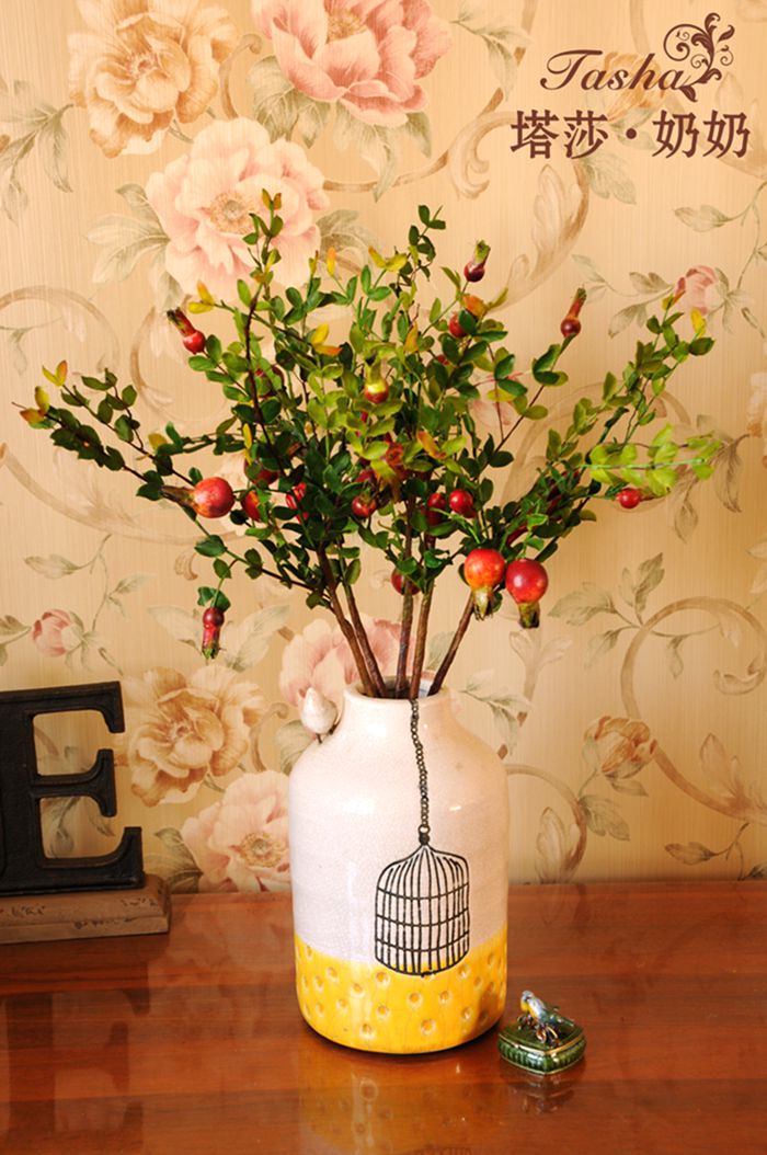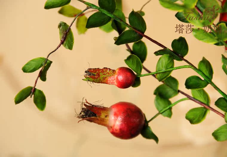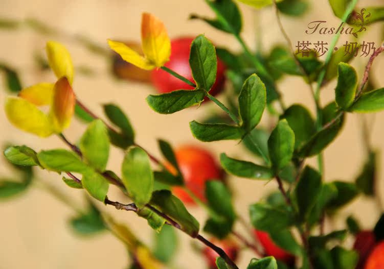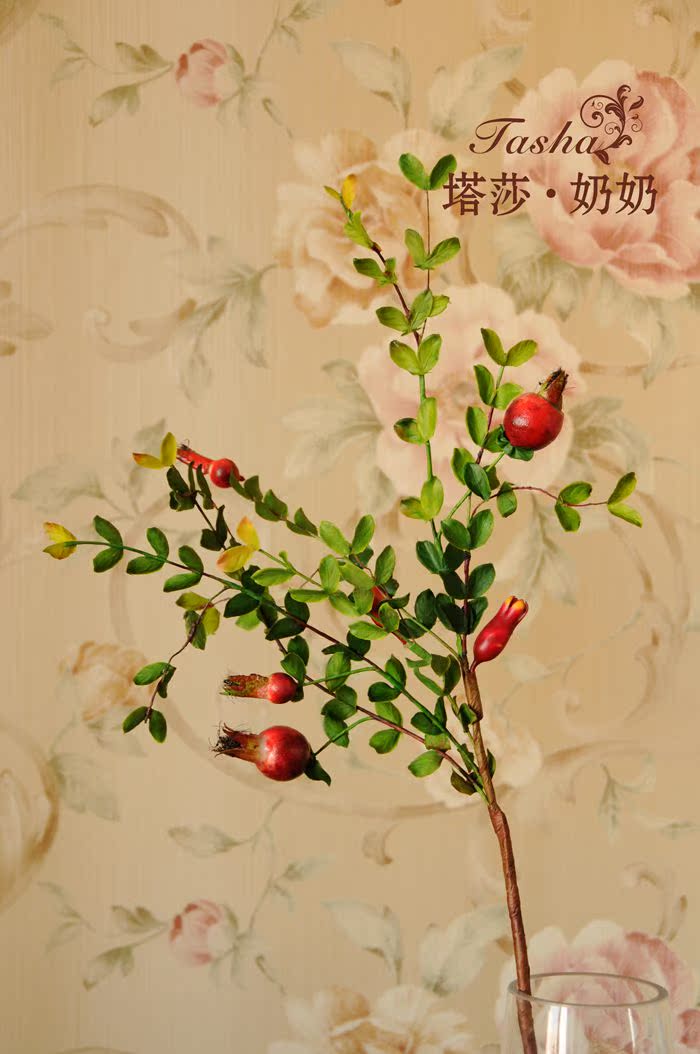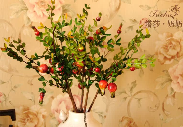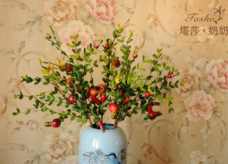 紅紅的小石榴圓潤紅里透著些黃,像小燈籠一樣紅紅火火,仿真度較高,石榴果也是富貴,吉祥,繁榮的象征。果果全枝長約60厘米 葉片是絹布過膠專業制花手感膠,花瓶插入是5枝的效果。效果飽需8至10枝左右。5枝起哈。。。。
