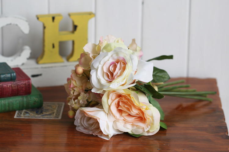 一束為玫瑰繡球混合捆扎把束,色調柔和溫馨,過渡自然,顯得清新雅致而富有情調。
