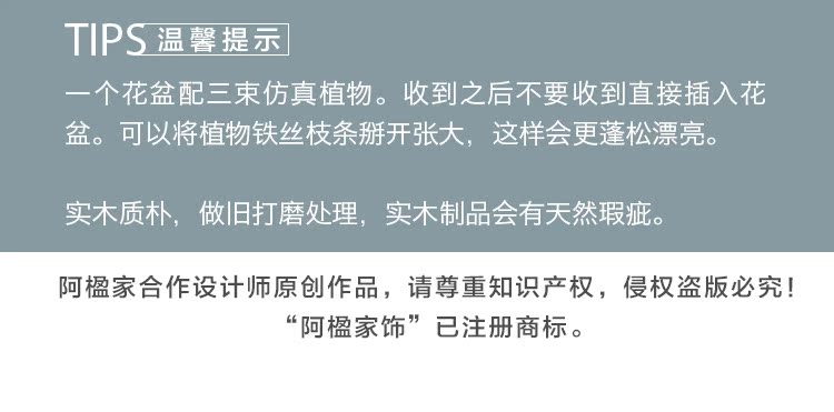 產品采用經濟林木材,天然植物材料、無味無污染的水性環保木器漆, 以手工制作生產為主,使用我們獨特的做舊工藝,模仿歲月留下的痕跡,質樸自然,懷舊溫馨。 以下范圍均屬于產品特性,并不是品質,不能作為免費退換貨理由,敬請注意: 包括并不限定:天然結疤、植物組織痕跡、自然侵蝕傷痕、材料天然色斑顏色不均、木材本來的孔洞、植物組織碎屑脫落、干燥引起的輕微裂紋、干燥引起的輕微翹曲、加工過程必然造成的輕微磕碰凹痕、做舊工藝的磨損、脫漆效果、做舊工藝的紋理凹凸粗糙、做舊工藝的風化褪色效果、形狀的不對稱性、大小粗細區別等等非人為損壞因素。 1。仿真花是人工組裝的,經過運輸擠壓,會有不同程度的收縮變形。親只需要拿出來輕抖幾下,把枝葉的位置調整好,或者手動折彎修剪下根莖,就會得到美美的形態啦! 2。插花作品偶爾會有小花材脫落,一般是可以自行插回去的呢!不會影響觀賞的,如果可以蘸一下膠水再插回更牢固哦! 3。保養辦法:避開強烈日光直射,經常使用撣子拂去或用吹風筒吹走浮塵。