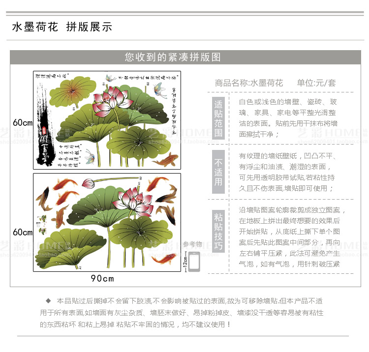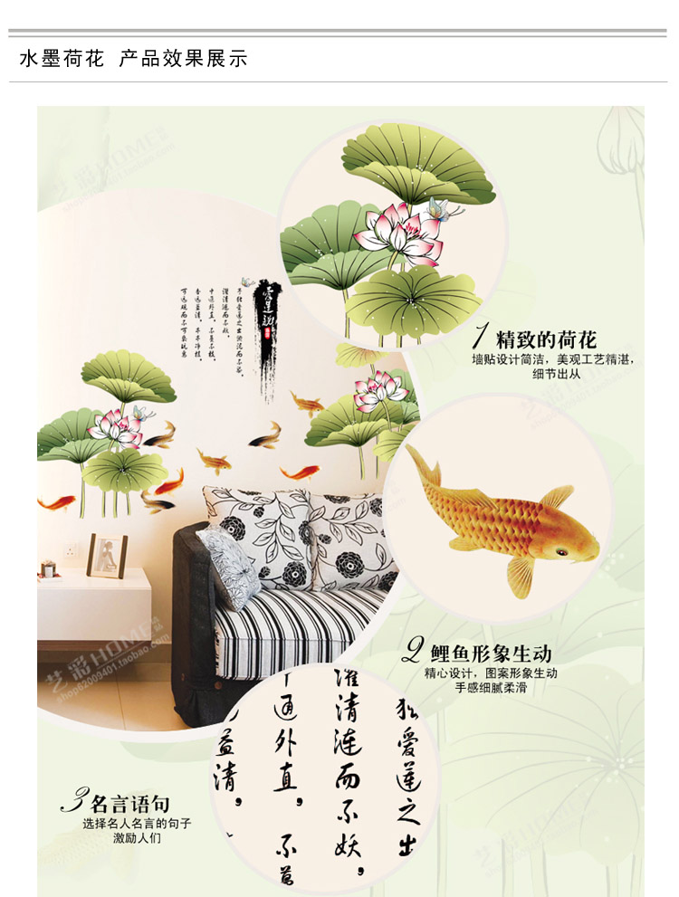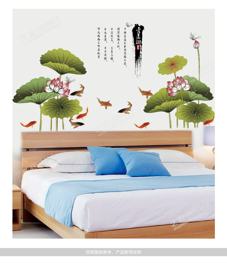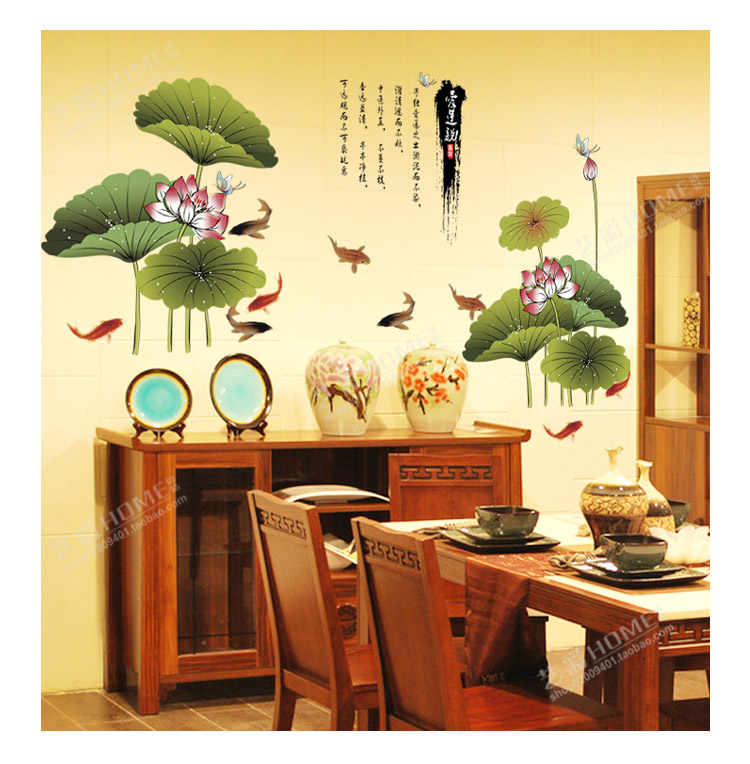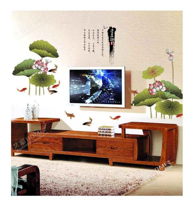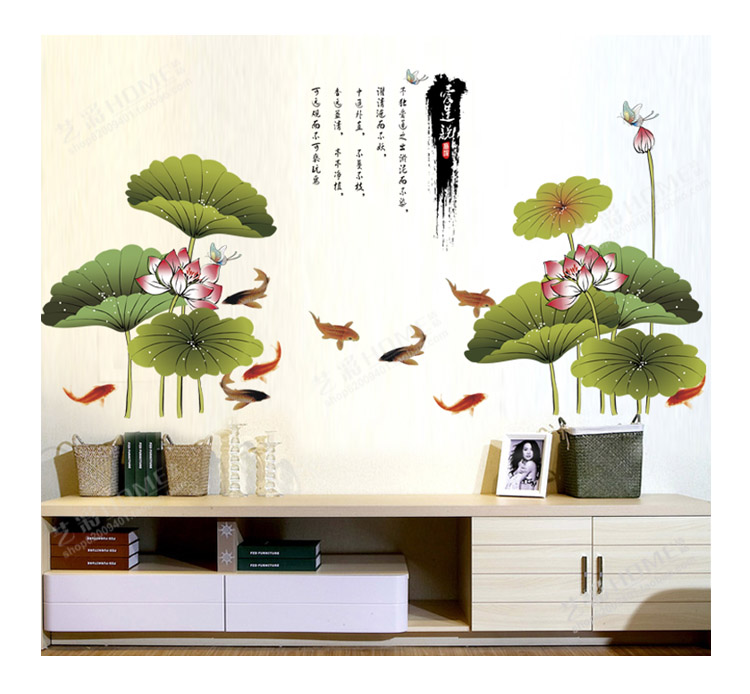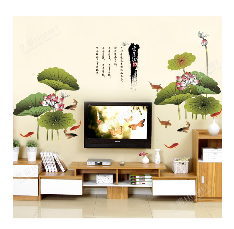 三代環保PVC可移除膠超大荷花民族風景字畫墻貼紙客廳沙發電視背景墻壁大貼畫墻畫墻面裝飾