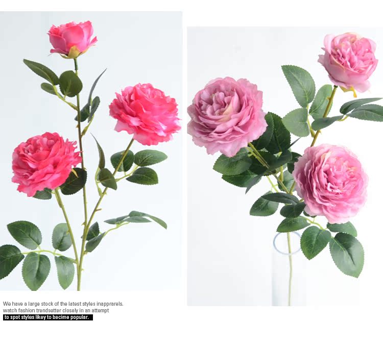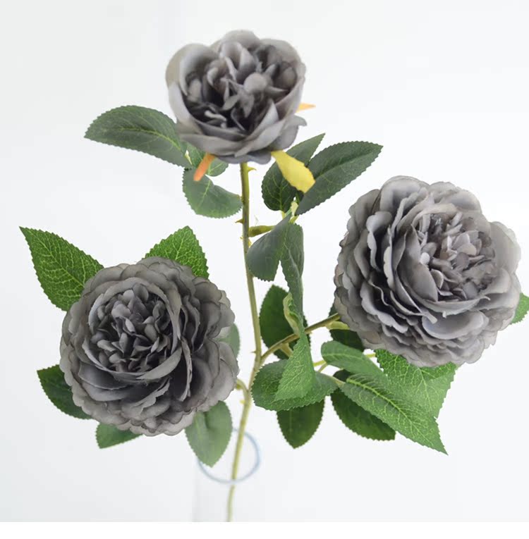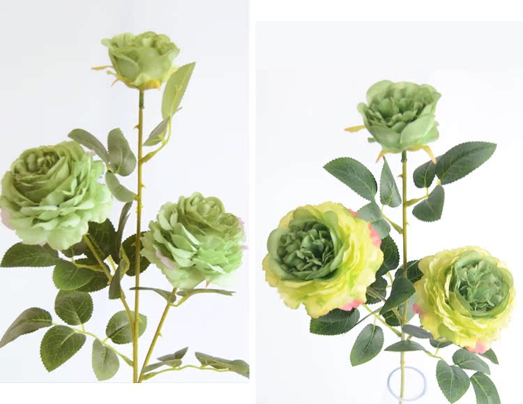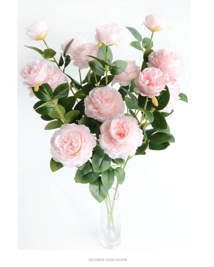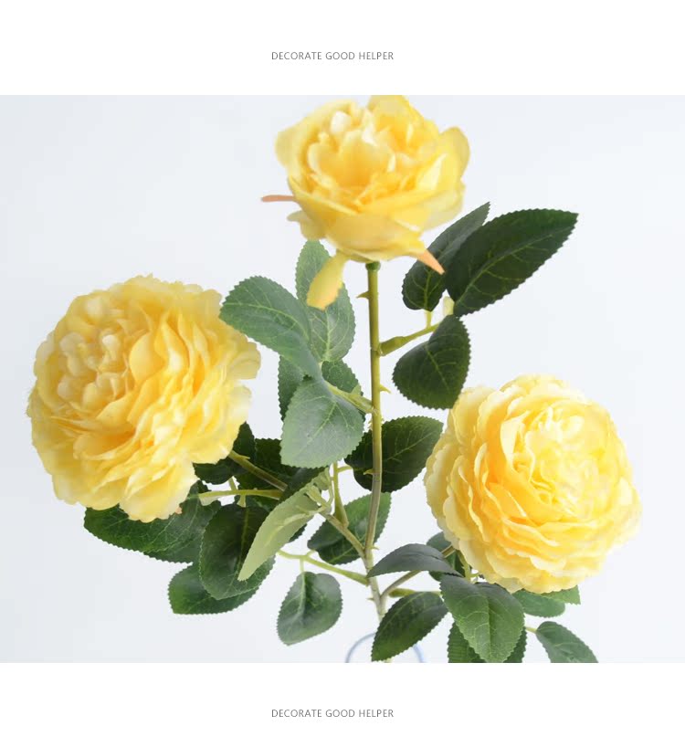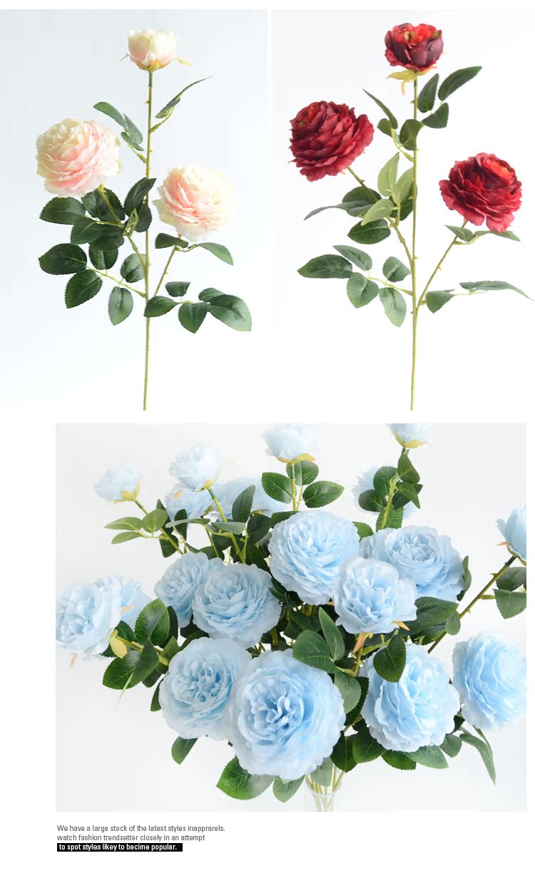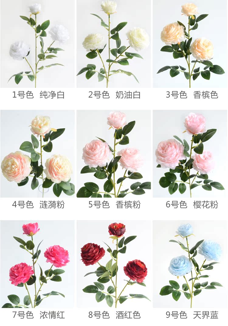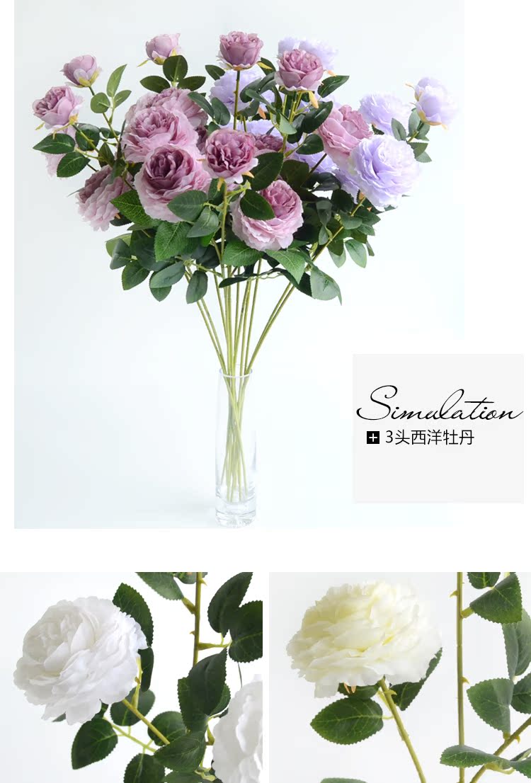 1號色純凈白1支長桿帶葉3頭西洋牡丹玫瑰花仿真花擺件家居飾品客廳裝飾花