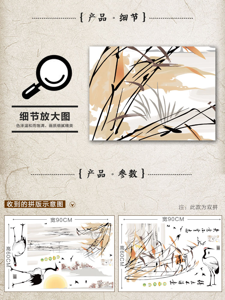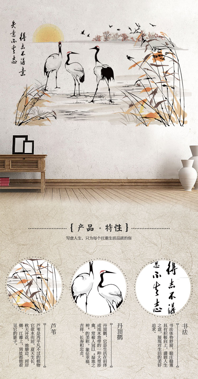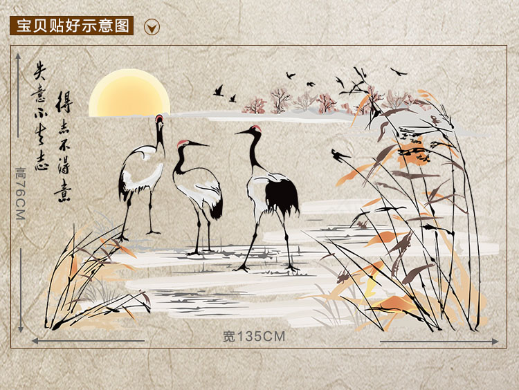 圖片色超大墻貼可移除 民族風客廳臥室書房布置貼紙 古典貼畫飛鶴風景貼