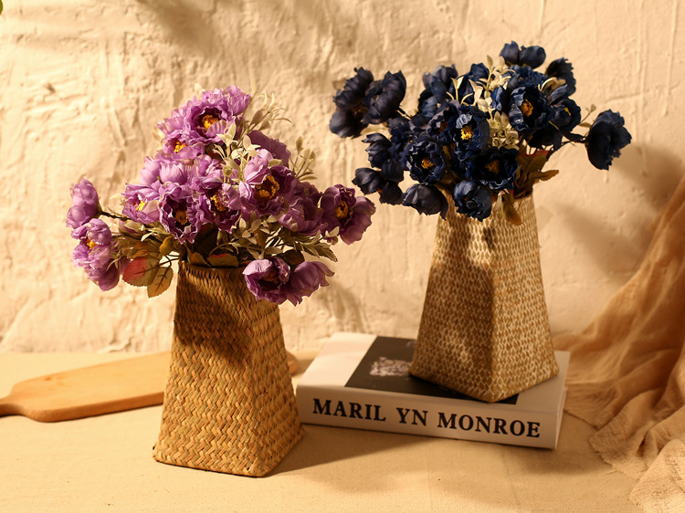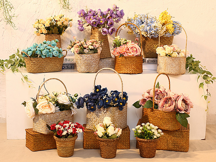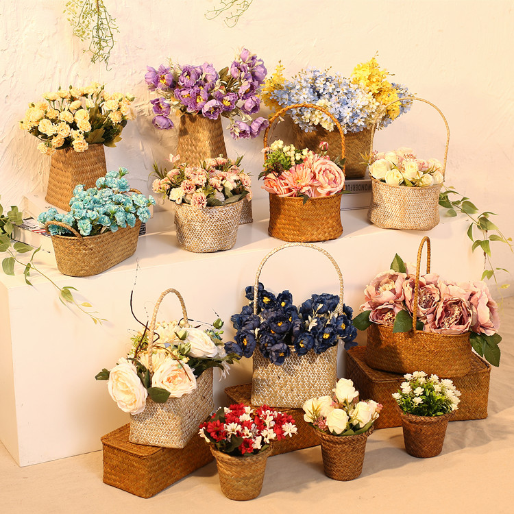 圓形小號配2束花中花籃擺件海草編花盆套裝藤編筐收納插花籃子客廳編織花盆藤編花盆