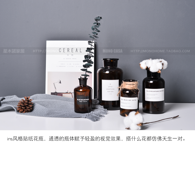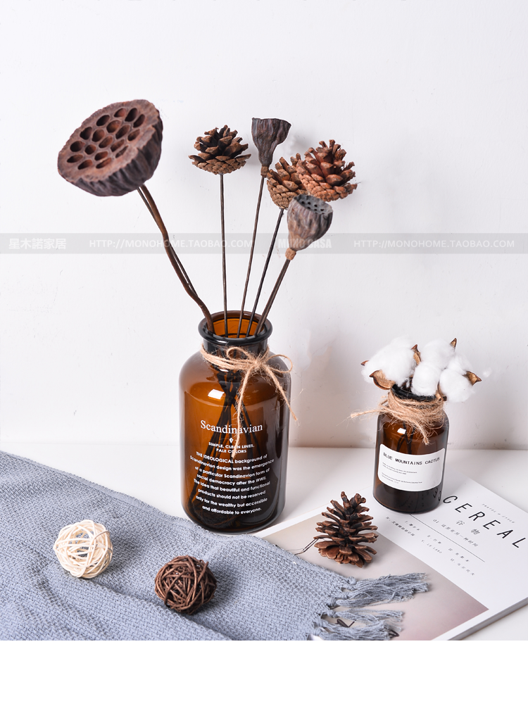 英文大號+1大蓮蓬+2小蓮蓬+4松果北歐風ins玻璃花瓶復古小棕瓶簡約家居桌面水培干花器裝飾品擺件