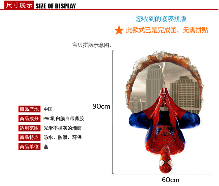 3D感蜘蛛俠特大倒掛蜘蛛俠3D感立體墻貼破墻人物貼紙家居裝飾客廳臥室壁畫
