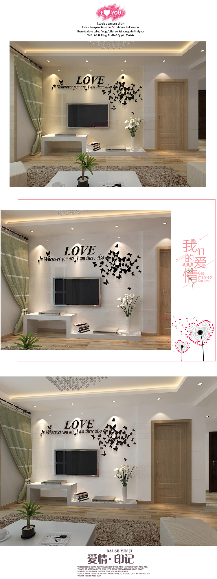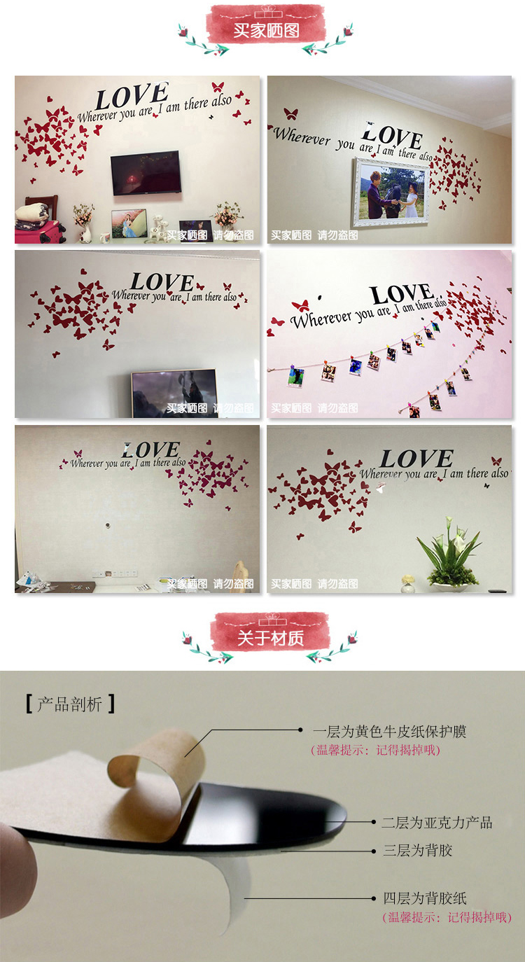 029浪漫-大紅+黑-右版小蝴蝶亞克力3d立體墻貼畫客廳電視背景墻貼紙浪漫臥室溫馨床頭裝飾