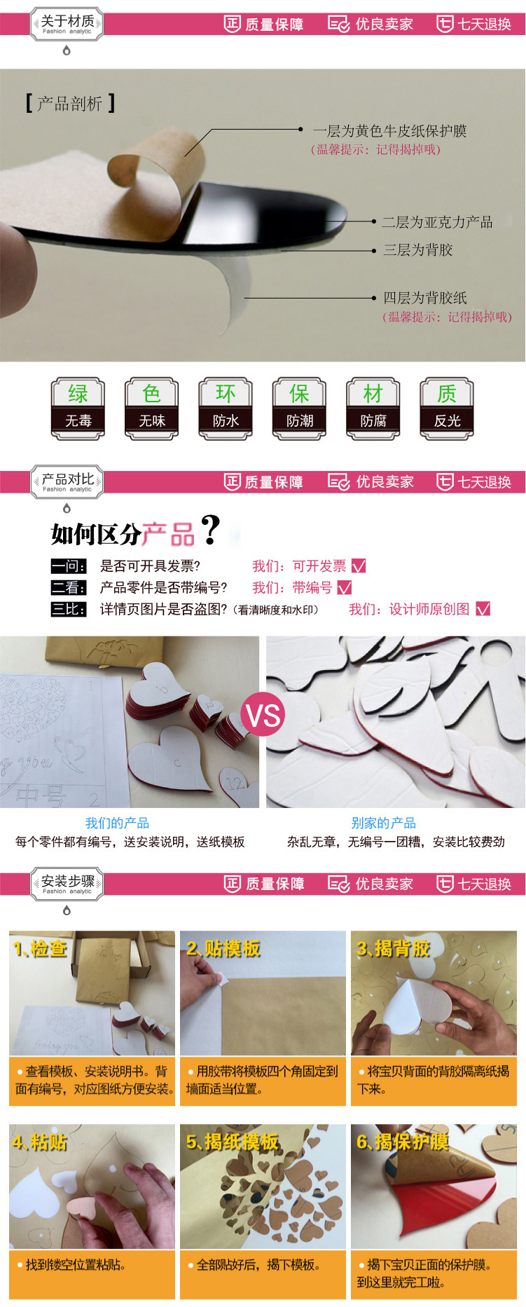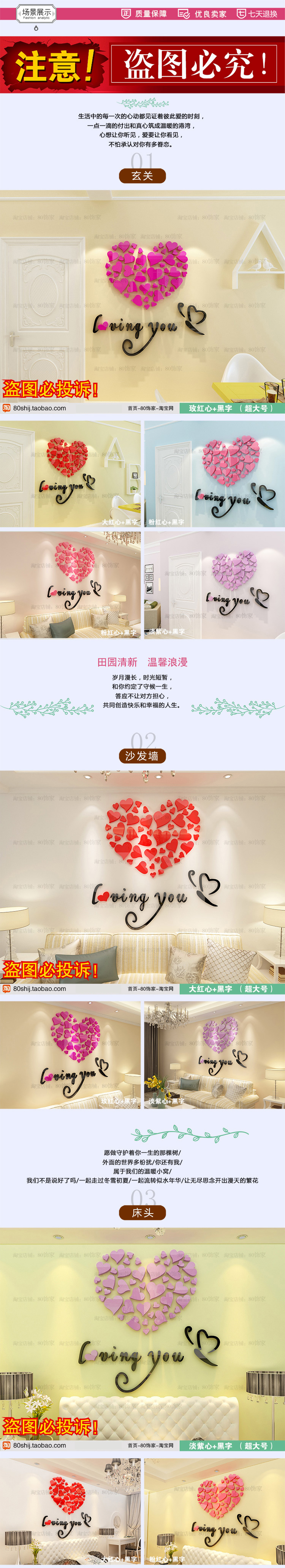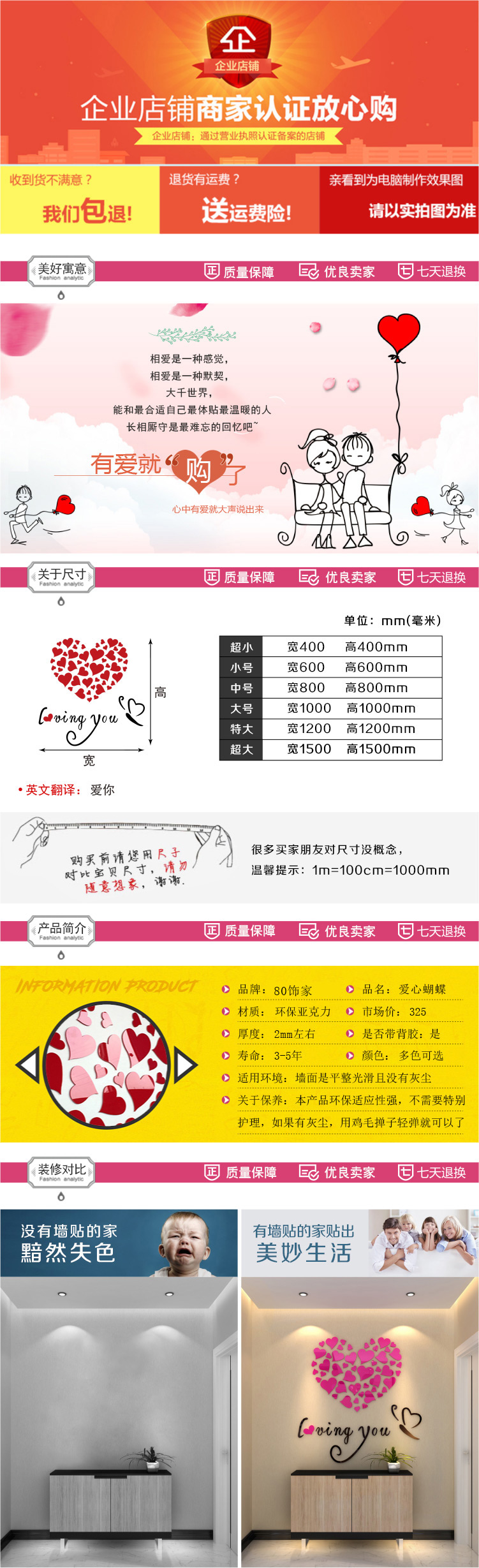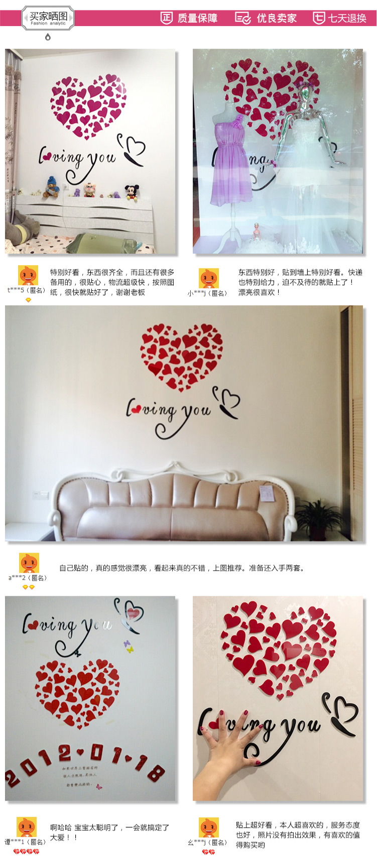 011愛心蝴蝶-大紅心+黑字小浪漫愛心亞克力3d立體墻貼畫臥室溫馨房間床頭裝飾品客廳墻壁貼紙