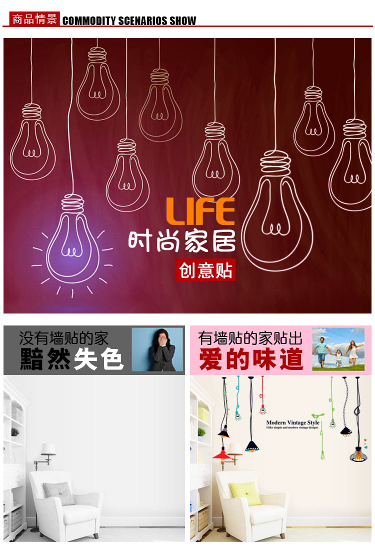 桔色特大可移除墻貼紙 臥室床頭客廳玄關廚房裝飾貼 小資情調燈泡燈飾貼
