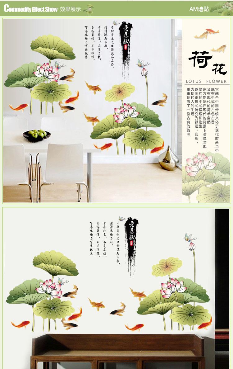 三代可移除墻貼超大家飾墻貼 客廳書房電視墻背景可移除貼紙 民族風古典荷花